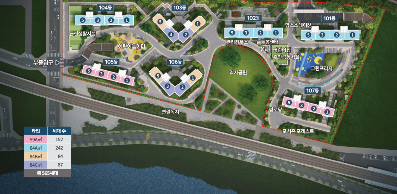 총 565세대이고 59와 84타입으로만 구성되어 있습니다.