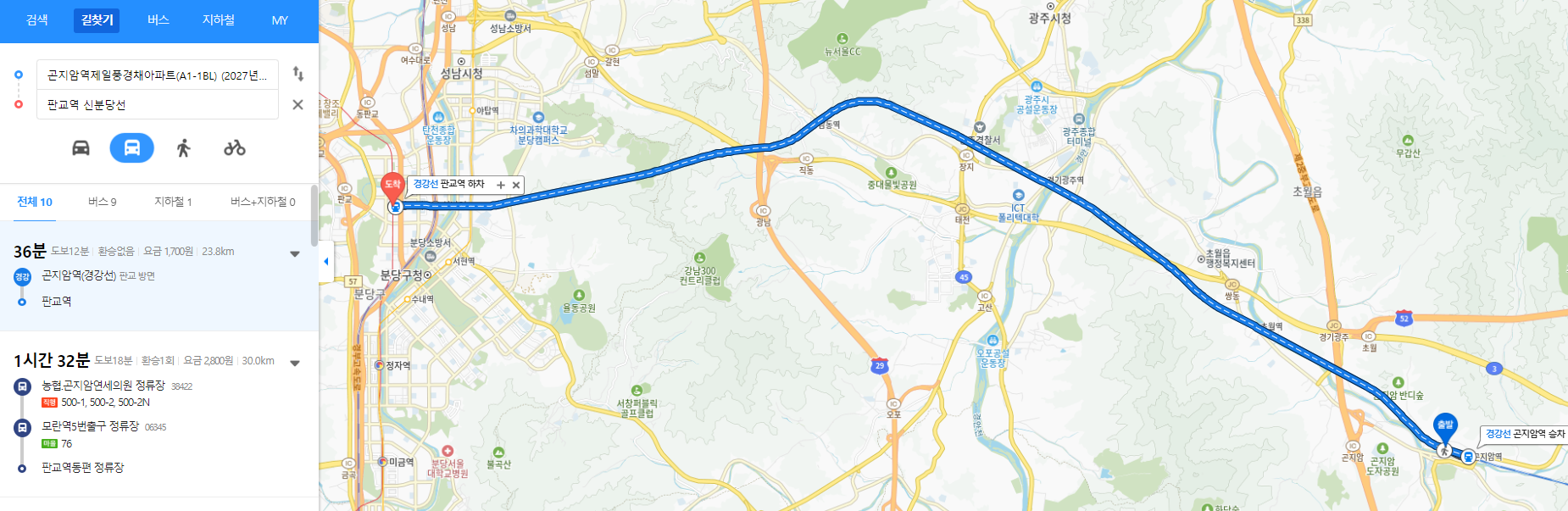 경강선 곤지암역 바로 옆에 위치해 있어서 판교역까지 경강선으로 36분 소요되네요.