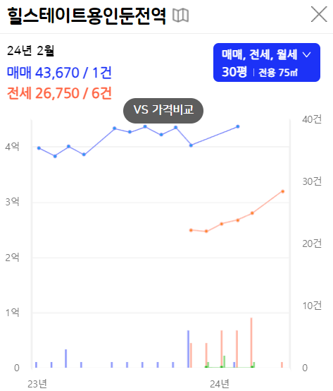 시세는 에버랜드 전역인 둔전역에 24년 1월 입주한 힐스테이트와 비교해봤습니다.