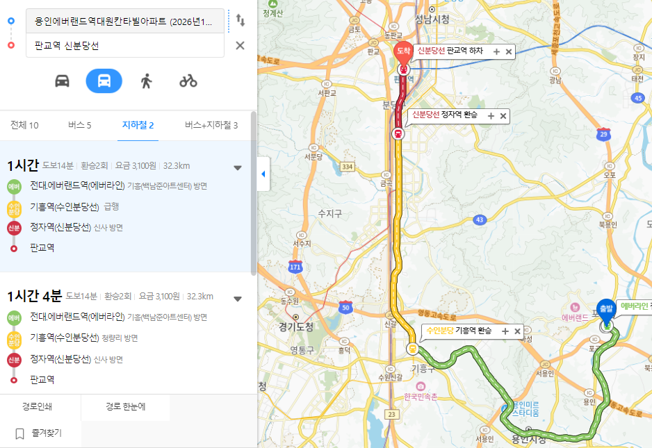 판교역 1시간 (버스 45분) 정도 소요됩니다.