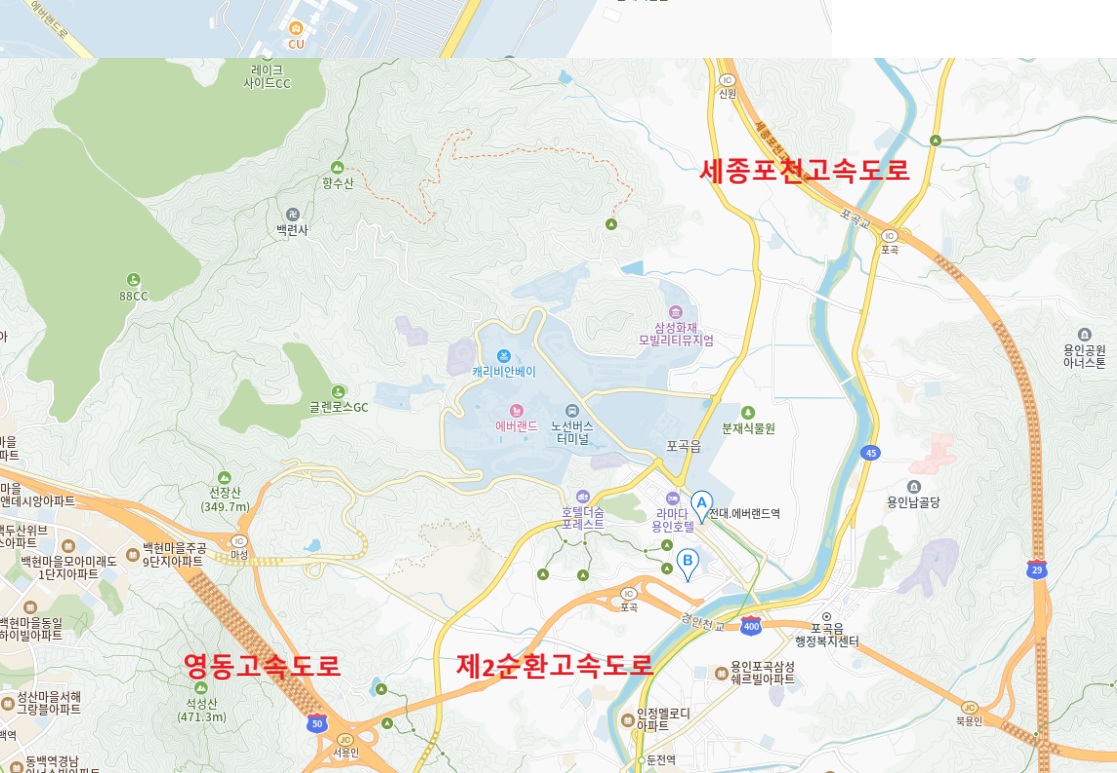조금 더 멀리 보면 영동고속도로와 위의 진한 선의 세종포천 고속도로도 가까이 위치해 있어 고속도로 교통은 편리할 것 같습니다.