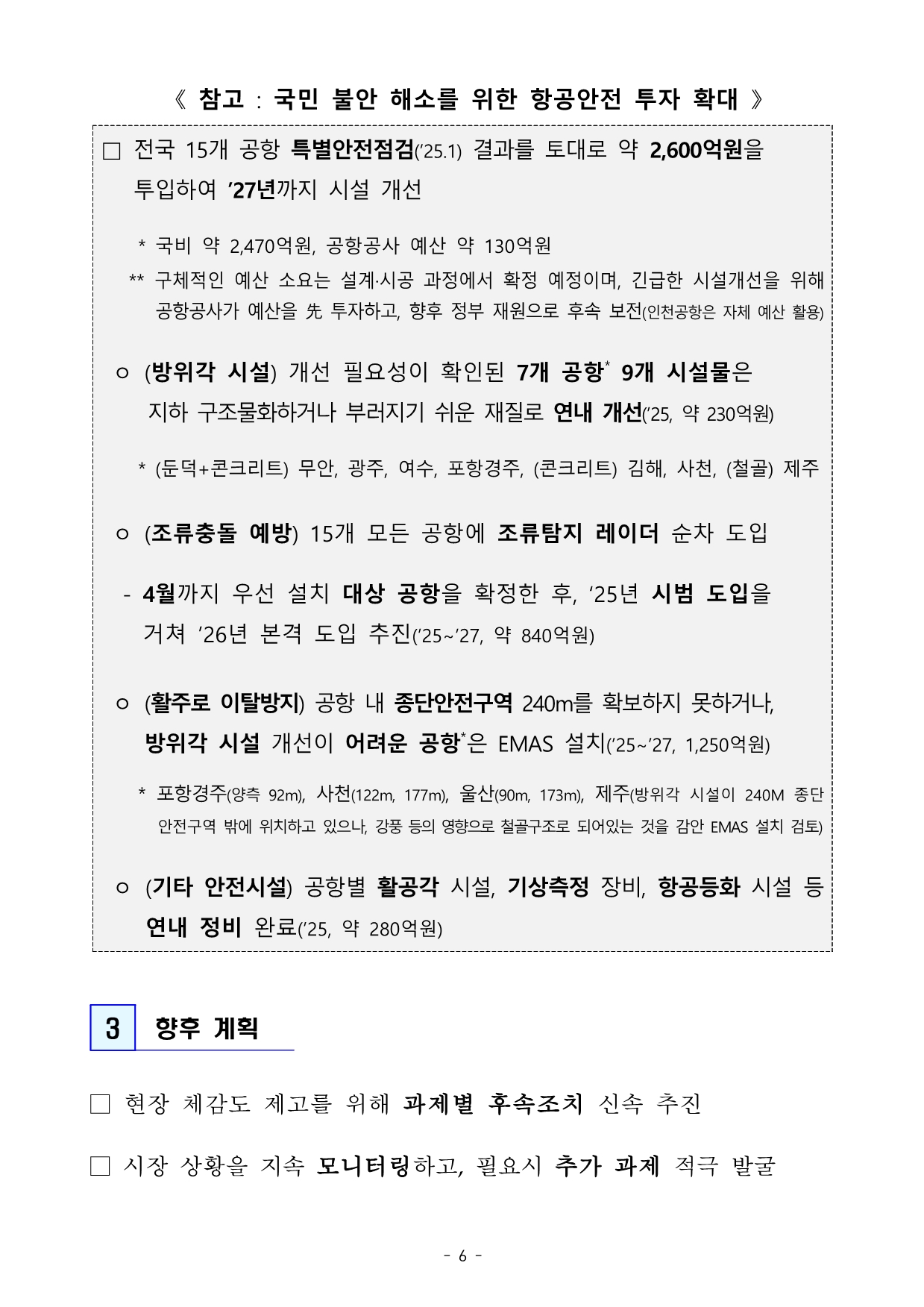 - 공항시설 개선(2,600억 원 투입), 조류충돌 예방 레이더 도입, 활주로 안전 강화.