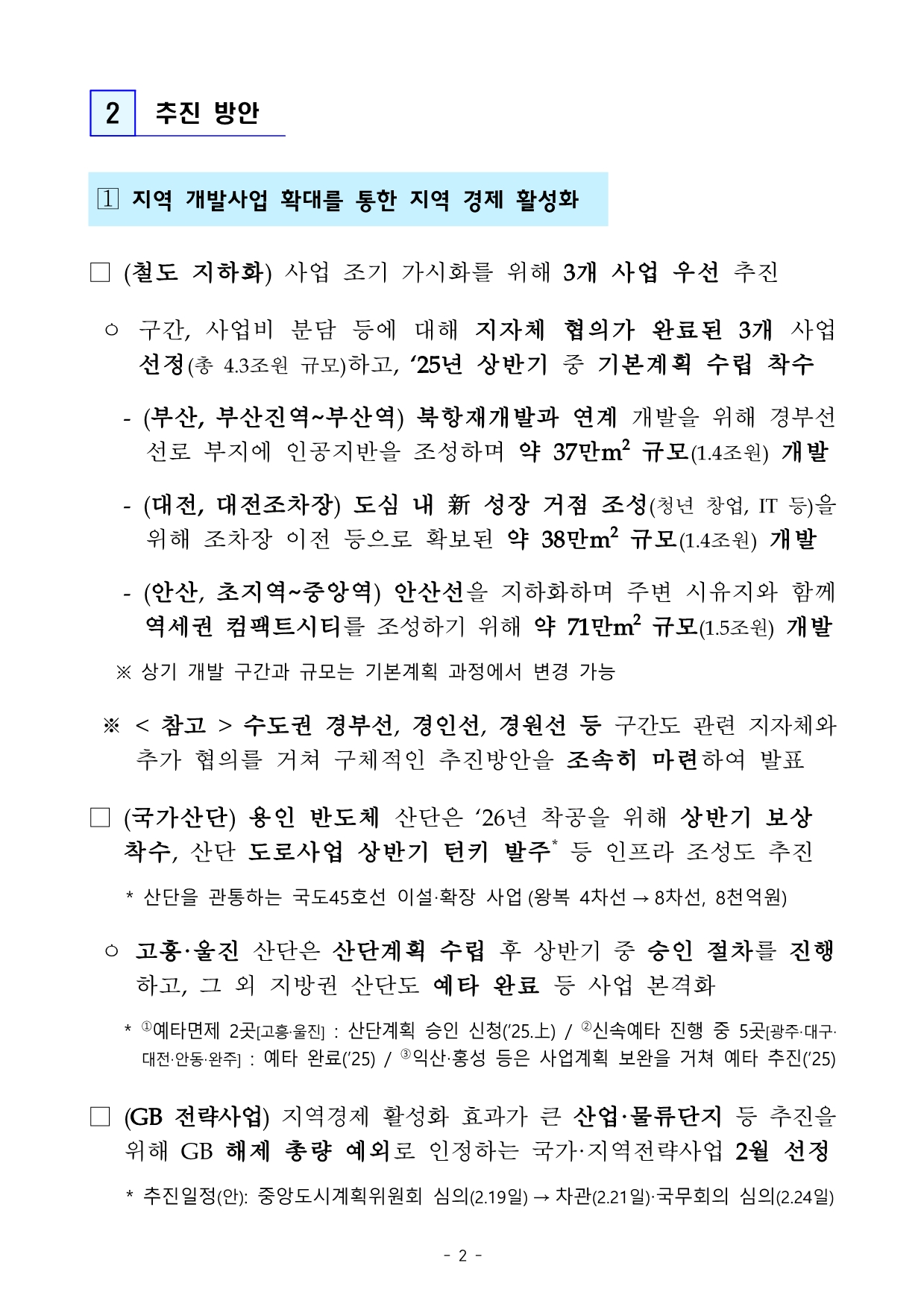 - 철도 지하화: 부산, 대전, 안산 3개 구간 우선 추진 (총 4.3조 원).