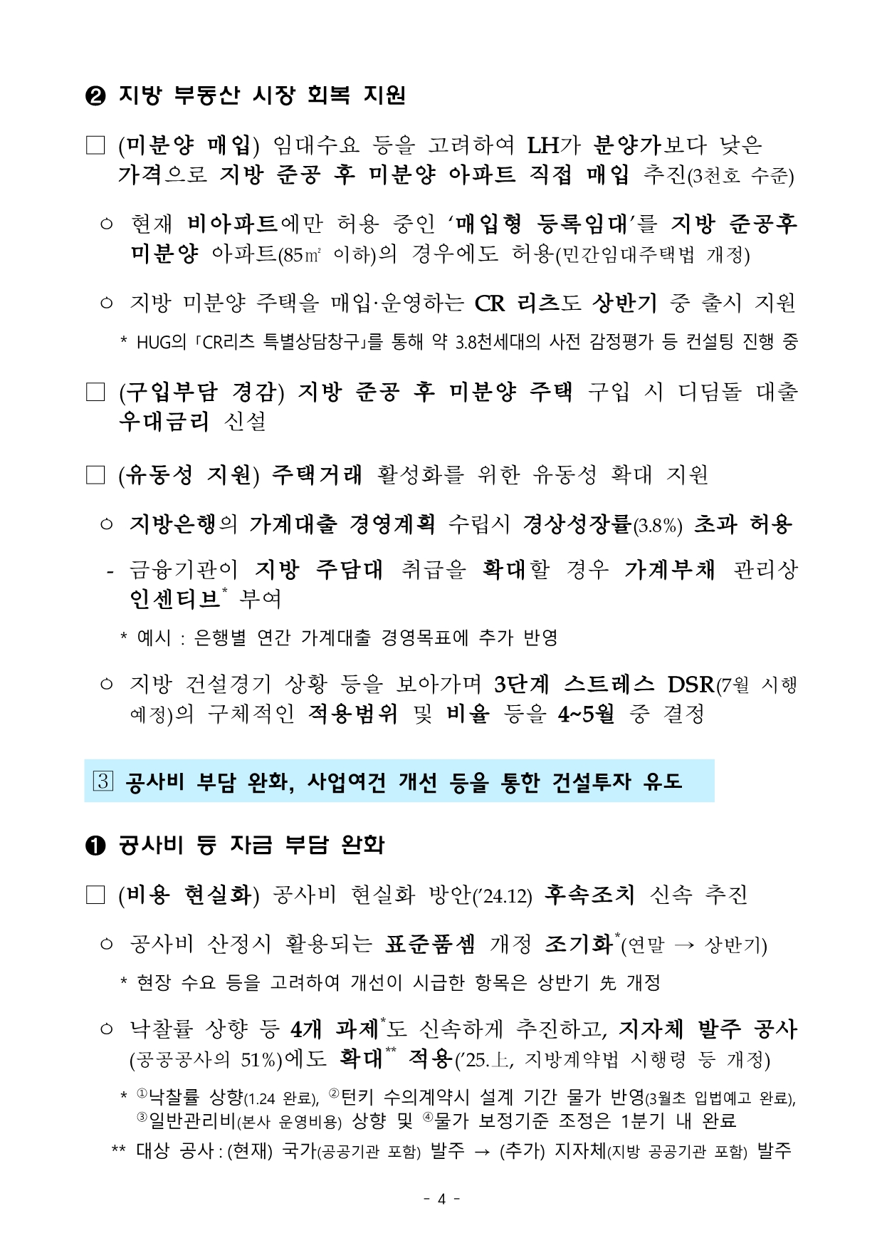 - 미분양 주택 매입: LH가 3천 호 매입, CR 리츠 출시 지원.