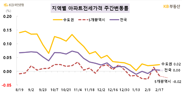 전세는 서울과 수도권만 0.02% 약한 상승이며, 그 외 지역은 0% 보합상태입니다.