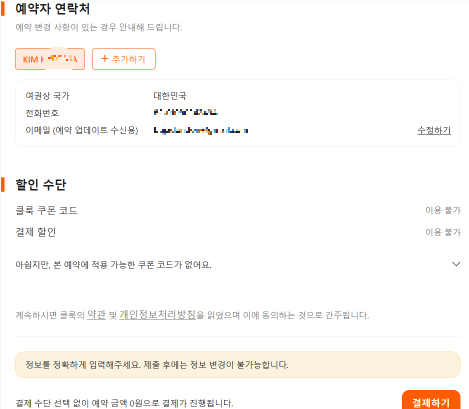 예약자의 정보를 넣고 결제하기를 누릅니다. 예약자 정보는 나중에 호텔예약이나 QR인증에도 필요하니까 전화번호와 이메일 주소는 정확이 입력해 주세요!! 결제는 0원입니다!