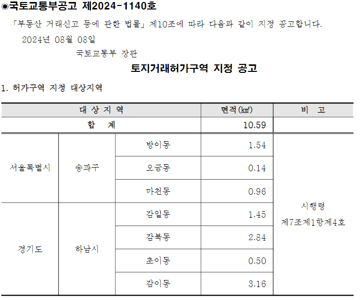 이번에 8.8 부동산 정책 후 토지거래허가구역 1호로 지정된 송파, 하남은