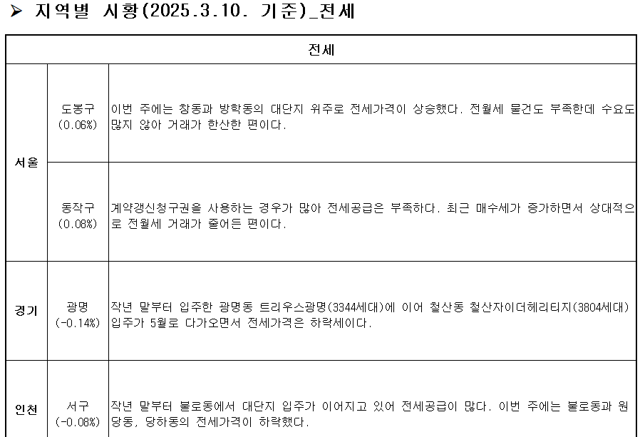 서울 전세는 0.05% 상승했습니다. 강동구(0.19%), 강남구(0.18%), 용산구(0.15%), 동작구(0.08%), 중랑구(0.08%) 등이 상승, 금천구(-0.06%), 성북구(-0.04%), 강북구(-0.03%) 등은 하락했습니다.