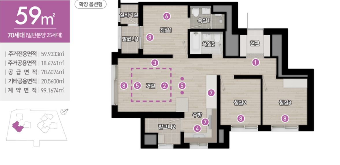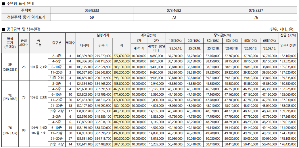 분양가는 59타입은 4억, 73타입은 4.8억, 76타입은 5억 정도입니다.