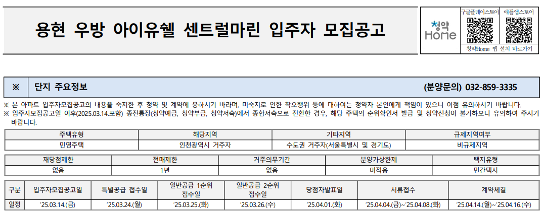 2025년 3월 24일부터 용현우방 아이유셀 센트럴마린 아파트가 분양을 시작합니다.