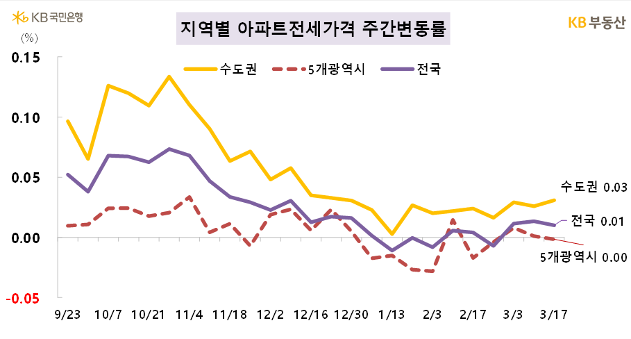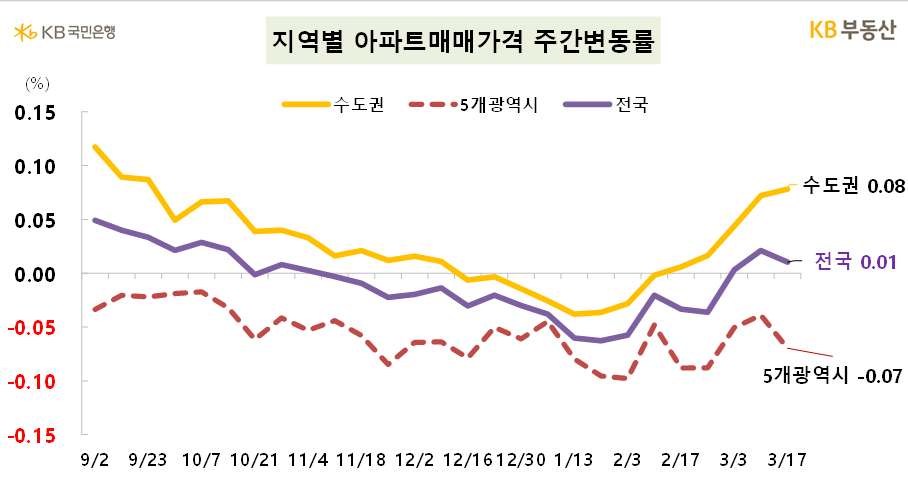 KB부동산이 발표한 주간KB아파트시장동향 자료에 따르면 전국 아파트 매매는 전주 대비 0.01%, 전세도 0.01% 상승했습니다. 서울 아파트 매매는 0.29%, 전세가 0.05% 상승하면서 지난 주보다 매매 변동폭이 커졌습니다. 경기도 매매는 -0.01% 하락, 전세 0.03% 상승, 수도권 매매는 0.08% 상승했습니다. 서울의 매수우위지수는 전주 69.4보다 소폭 하락한 68입니다.