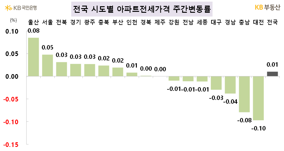 전국 아파트 전세가격은 0.01% 상승했습니다. 수도권은 0.03% 상승, 기타 지방은 -0.02% 하락했습니다. 서울 전세는 0.05% 상승했다. 영등포구(0.2%), 중구(0.17%), 용산구(0.14%), 강동구(0.13%), 서초구(0.1%) 등이 상승, 성북구(-0.1%), 광진구(-0.09%), 금천구(-0.05%) 등은 하락했습니다.