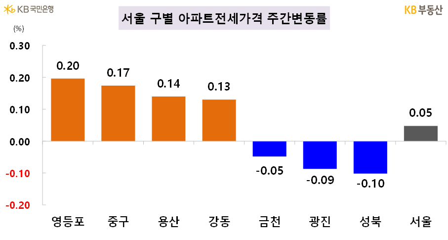 전국 아파트 전세가격은 0.01% 상승했습니다. 수도권은 0.03% 상승, 기타 지방은 -0.02% 하락했습니다. 서울 전세는 0.05% 상승했다. 영등포구(0.2%), 중구(0.17%), 용산구(0.14%), 강동구(0.13%), 서초구(0.1%) 등이 상승, 성북구(-0.1%), 광진구(-0.09%), 금천구(-0.05%) 등은 하락했습니다.