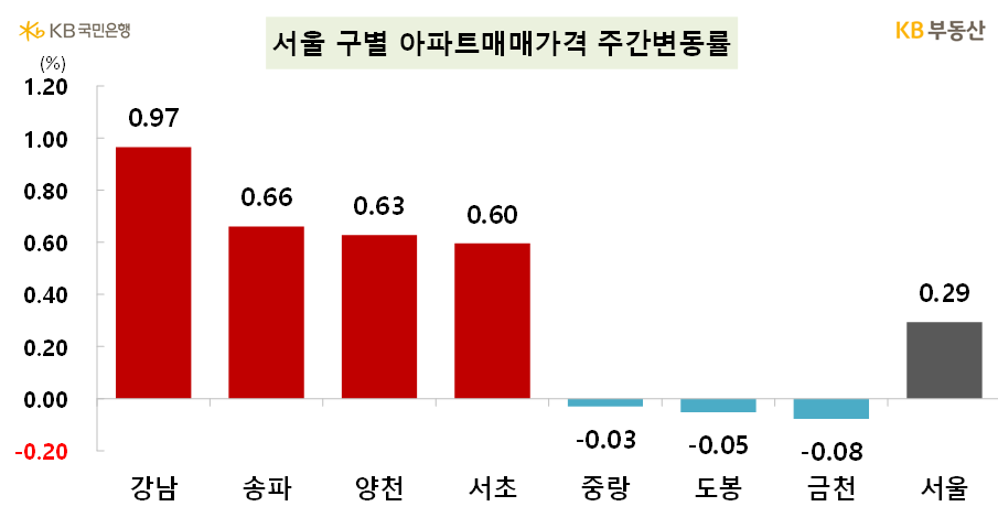 KB부동산이 발표한 주간KB아파트시장동향 자료에 따르면 전국 아파트 매매는 전주 대비 0.01%, 전세도 0.01% 상승했습니다. 서울 아파트 매매는 0.29%, 전세가 0.05% 상승하면서 지난 주보다 매매 변동폭이 커졌습니다. 경기도 매매는 -0.01% 하락, 전세 0.03% 상승, 수도권 매매는 0.08% 상승했습니다. 서울의 매수우위지수는 전주 69.4보다 소폭 하락한 68입니다.