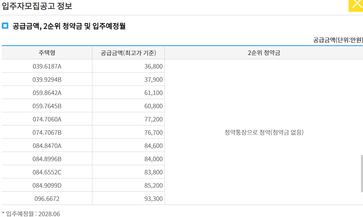 입주는 2028.6월로 예정되어 있으며 분양가격은 아래와 같습니다.