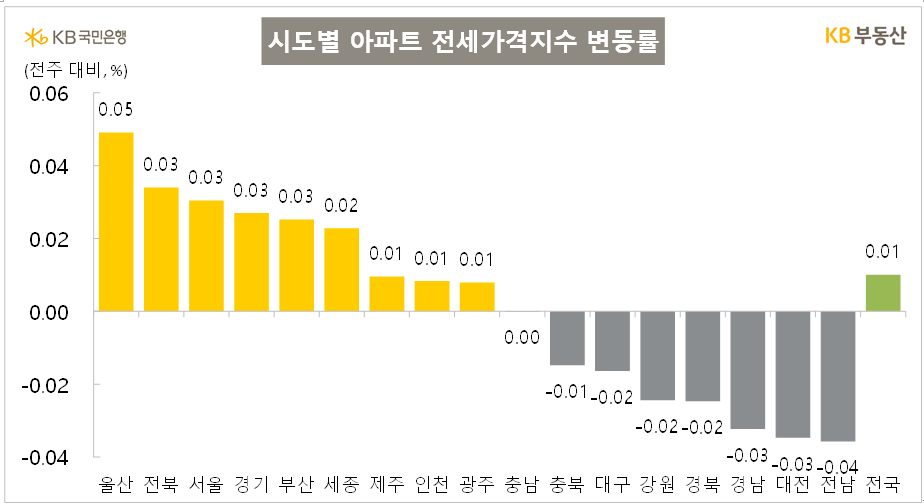전국 아파트 전세가격은 전주 대비 0.01% 상승했다. 3월부터 매주 0.01%씩 오르면서 9주 연속 상승세를 보였습니다.