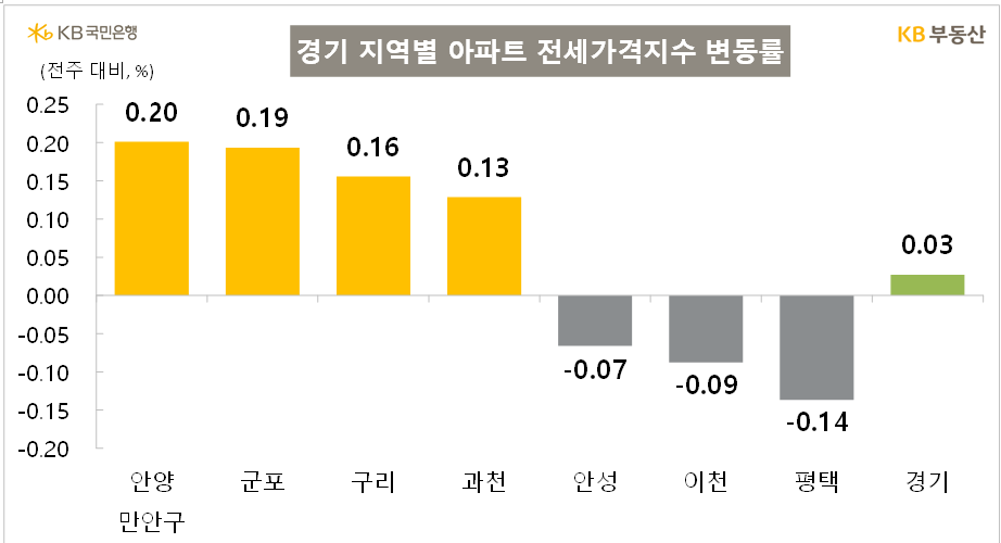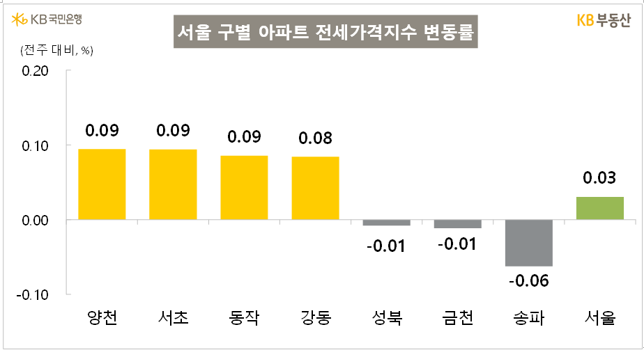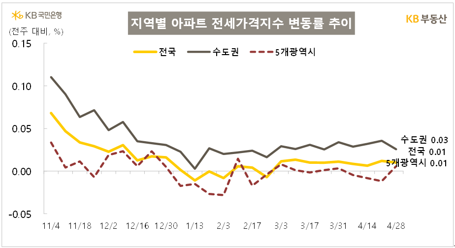 수도권 아파트 전세가격은 0.03% 올랐다. 서울(0.03%), 경기(0.03%), 인천(0.01%) 모두 상승 흐름을 나타냈습니다. 인천을 제외한 5개 광역시(0.01%)는 3월 둘째 주(조사기준 3월 10일)부터 보합권에서 머물렀다가 이번주 소폭 오르면서 상승으로 돌아섰습니다. 울산(0.05%), 부산(0.03%), 광주(0.01%)는 상승했고, 대구(-0.02%), 대전(-0.03%)은 하락했습니다.