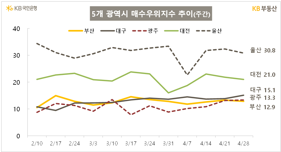 경기(28.1)와 인천(26.6) 수도권을 비롯해 울산(30.8), 대전(21.0), 대구(15.1), 광주(13.3), 부산(12.9) 5개 광역시에서도 '매도자 많음' 비중이 높습니다.