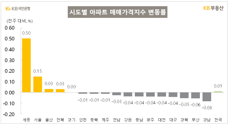 전국 아파트 매매가격 변동률은 전주 대비 0.01% 올랐다. 4주 연속 보합권에 머무르다 이번주 소폭 반등하면서 상승 전환했습니다.