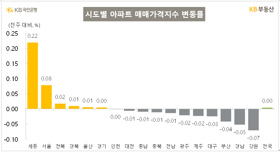 전국 아파트 가격 변동률은 지난주(조사기준 428) 대비 매매는 0.00%, 전세는 0.01% 기록했습니다.