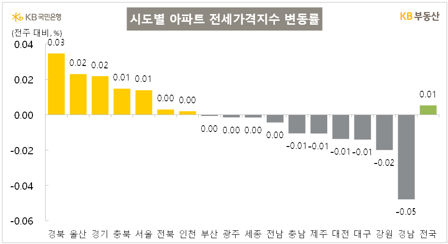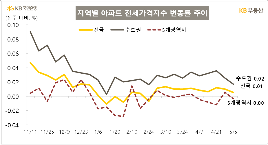 수도권 아파트 전세가격은 0.02% 올랐습니다. 서울(0.01%), 경기(0.02%)는 상승했고 인천(0.00%)은 보합에 그쳤습니다. 인천을 제외한 5개 광역시(0.00%)는 지난주(0.01%) 소폭 오르면서 상승으로 돌아섰다가 다시 보합에 머물렀습니다