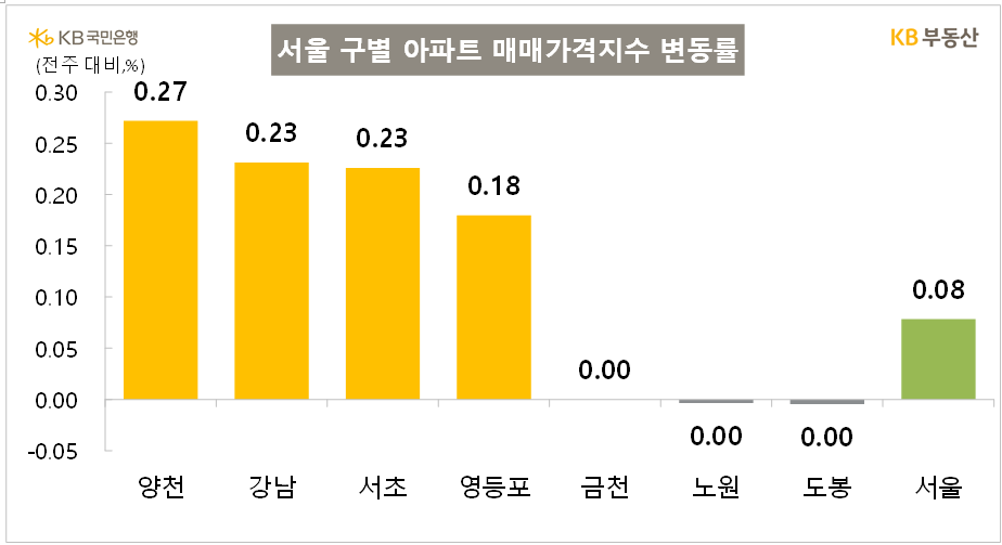 서울 아파트 매매가격은 0.08% 오르면서 15주 연속 상승했으며 상승폭은 전주(0.15%)보다 소폭 줄었습니다. 수도권(0.03%)은 경기, 인천 모두 0.00%의 변동률로 보합권에 머물렀고, 지역별로 살펴보면 인천을 제외한 5개 광역시(-0.02%)는 하락세를 보였습니다.