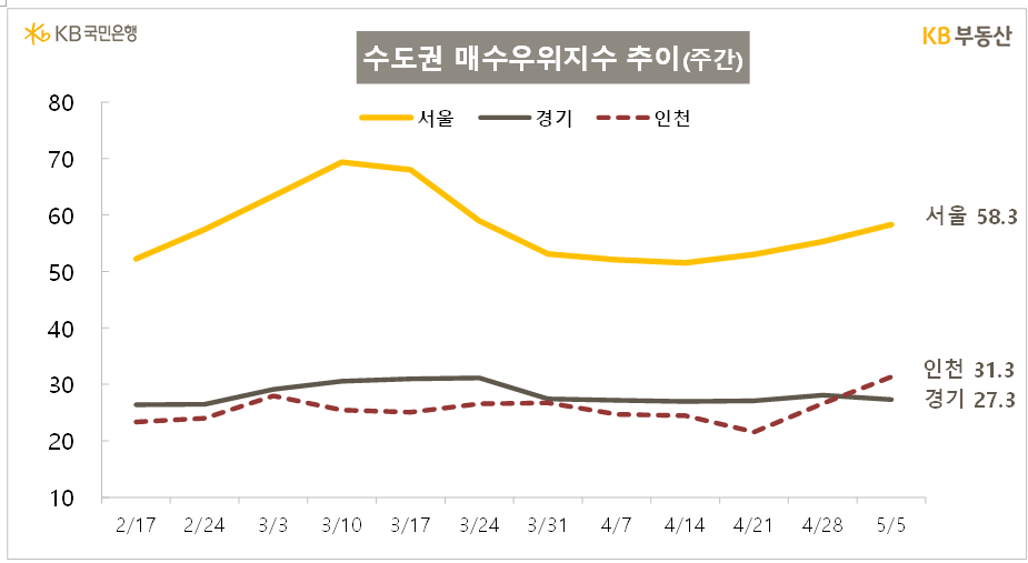 서울 매수우위지수는 58.3으로 전주(55.3)보다 3p 올랐습다. 4월 둘째 주(조사기준 414)부터 4주째 소폭 상승하는 추세이나, 100미만의 매도자 많음비중이 높다.