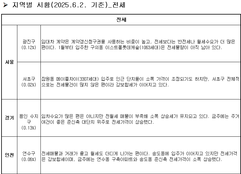 전국 아파트 매매가격 변동률은 전주 대비 0.03% 상승했습니다. 3월(조사기준 3월 3일)부터 보합권에서 오르내리다가 2주 연속 상승세를 보였습니다(4월 14일 0.00%→4월 21일 0.00%→4월 28일 0.01%→5월 5일 0.00%→5월 12일 0.01%→5월 19일 0.00%→5월 26일 0.03%→6월 2일 0.03%).