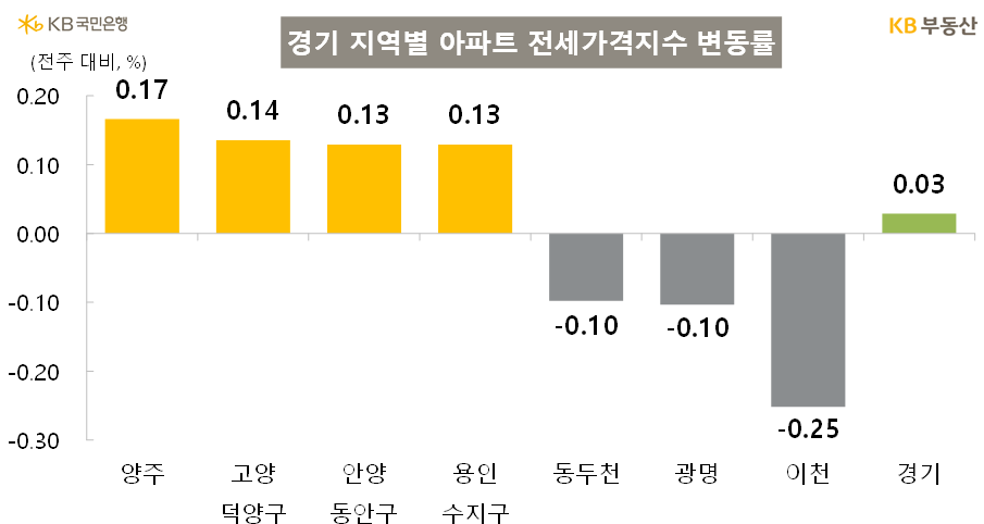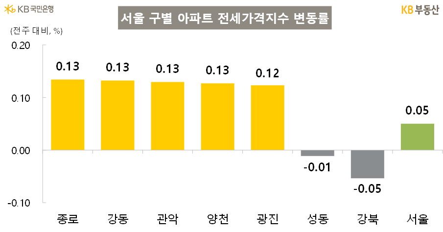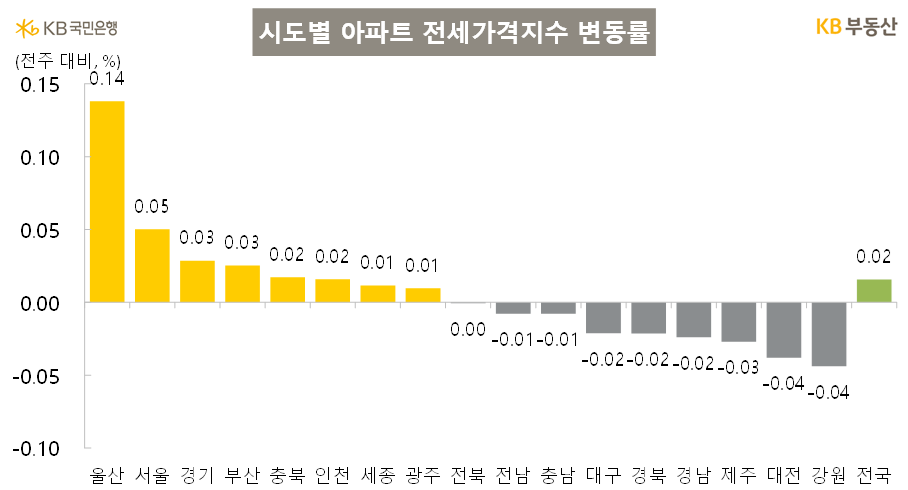 수도권 아파트 전세가격은 0.03% 올라 상승률은 전주(0.03%)와 비슷한 수준이다. 서울(0.05%), 경기(0.03%), 인천(0.02%) 전지역이 상승을 기록했습니다.