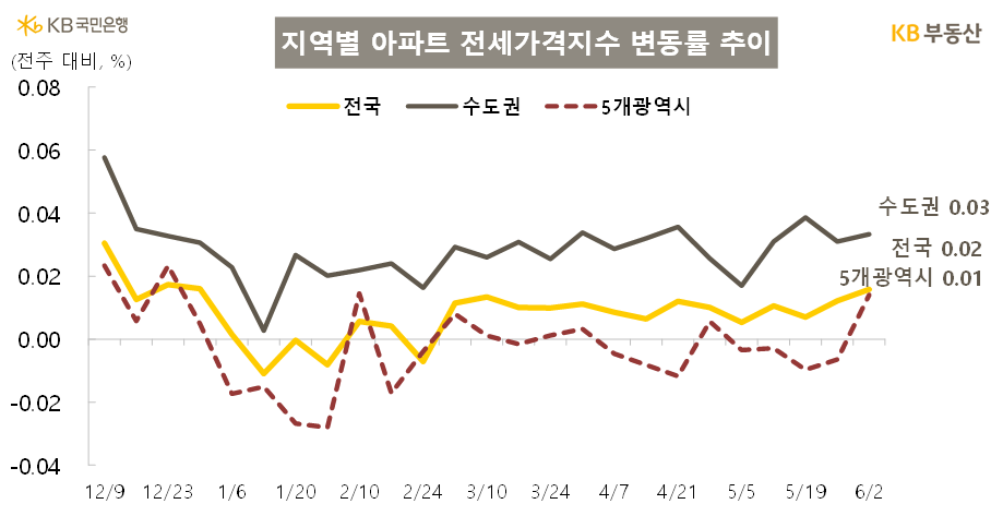 전국 아파트 전세가격은 전주 대비 0.02% 상승하여 14주 연속 오름세를 보였습니다(4월 14일 0.01%→4월 21일 0.01%→4월 28일 0.01%→5월 5일 0.01%→5월 12일 0.01%→5월 19일 0.01%→5월 26일 0.01%→6월 2일 0.02%).