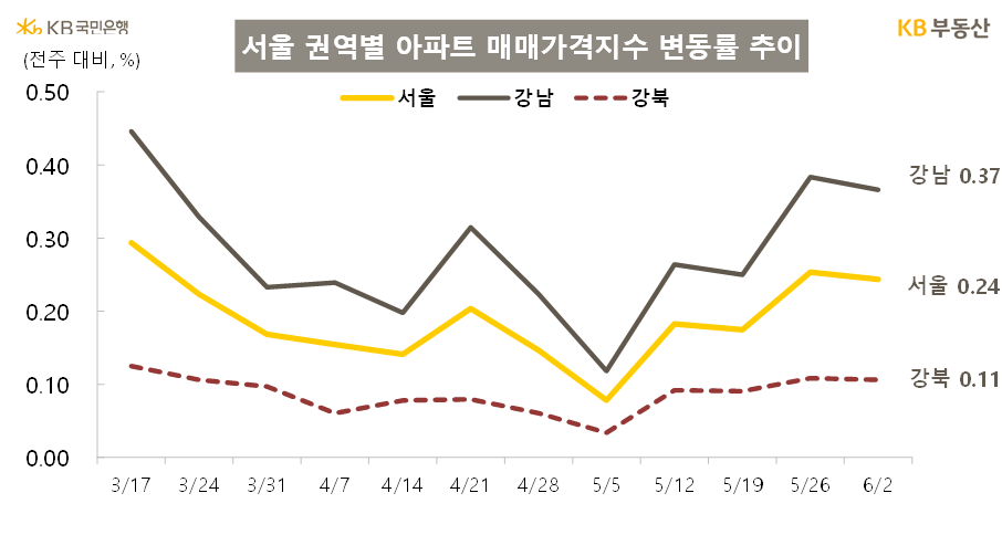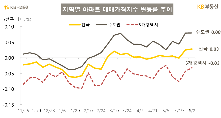 전국 아파트 매매가격 변동률은 전주 대비 0.03% 상승했습니다. 3월(조사기준 3월 3일)부터 보합권에서 오르내리다가 2주 연속 상승세를 보였습니다(4월 14일 0.00%→4월 21일 0.00%→4월 28일 0.01%→5월 5일 0.00%→5월 12일 0.01%→5월 19일 0.00%→5월 26일 0.03%→6월 2일 0.03%).