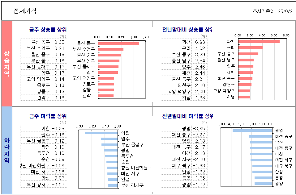 인천을 제외한 5개 광역시(0.01%)는 상승 전환해 2주 연속 하락하다가 이번주 반등했습니다(4월 14일 -0.01%→4월 21일 -0.01%→4월 28일 0.01%→5월 5일 0.00%→5월 12일 0.00%→5월 19일 -0.01%→5월 26일 -0.01%→6월 2일 0.01%). 지역별로 울산(0.14%), 부산(0.03%), 광주(0.01%)는 상승하고, 대구(-0.02%), 대전(-0.04%)은 하락했습니다.