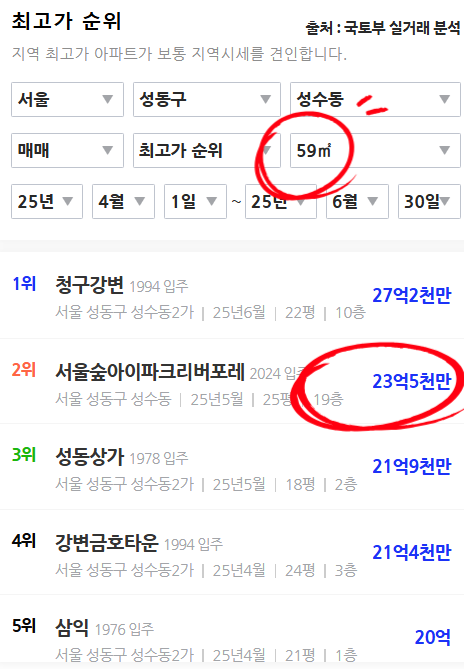 작년 말부터 지금까지 입주중인 서울숲 아이파크 리버포레 거래가격과 비교하면
