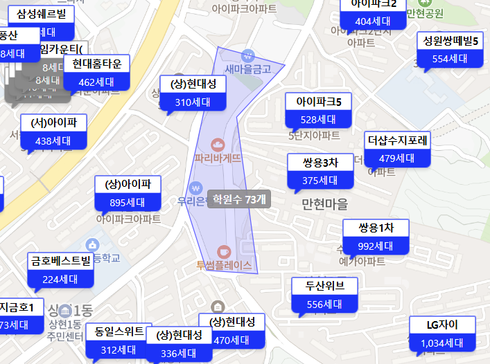 이 상가있는 구역에만 학원이 70여개가 되니, 아이파크, 현대성우