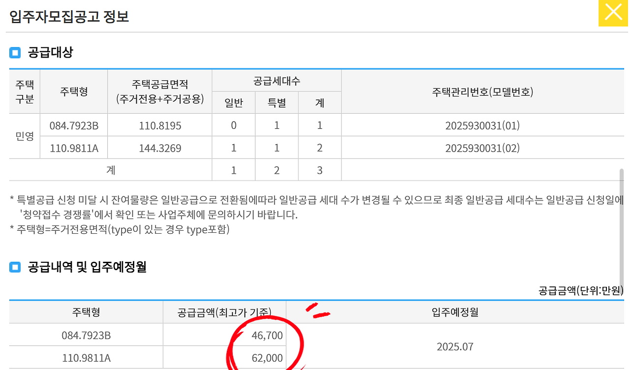 분양가는 84타입 4.7억 110타입 6.2억이고