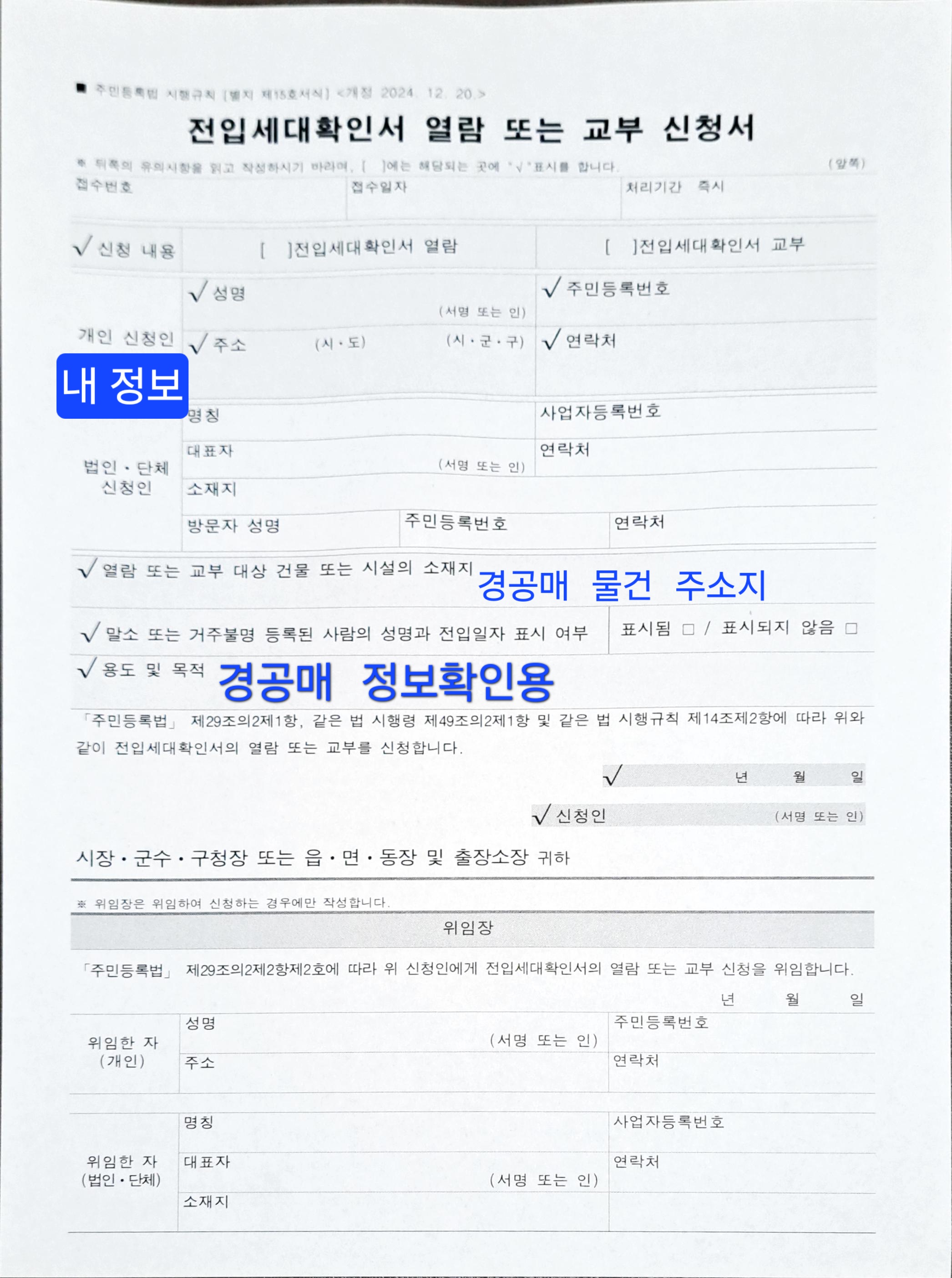 준비물 : 경공매에 나와있는 물건정보 / 내 신분증 / 전입세대 확인서 신청서