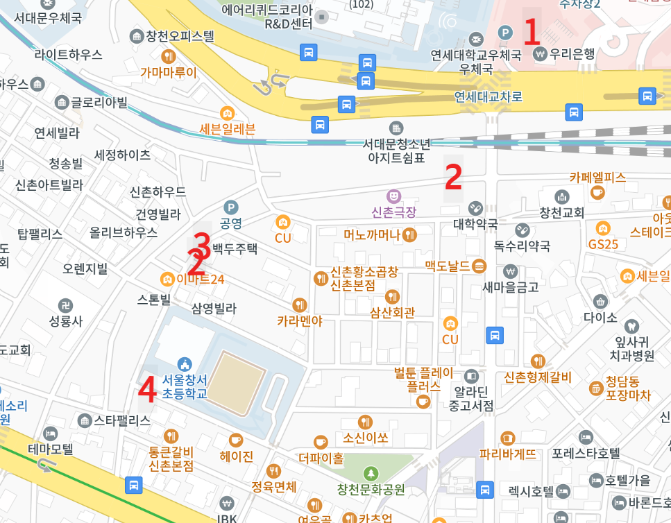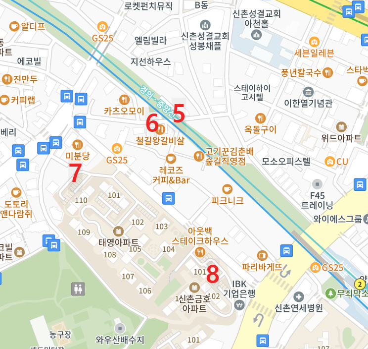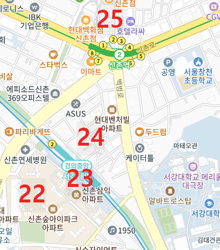 24. 경의중앙선 서강대역과 2호선 신촌역 사이의 삼각형 지역은 죄다 모텔, 호텔, 게스트하우스이다 ㅎㅎ