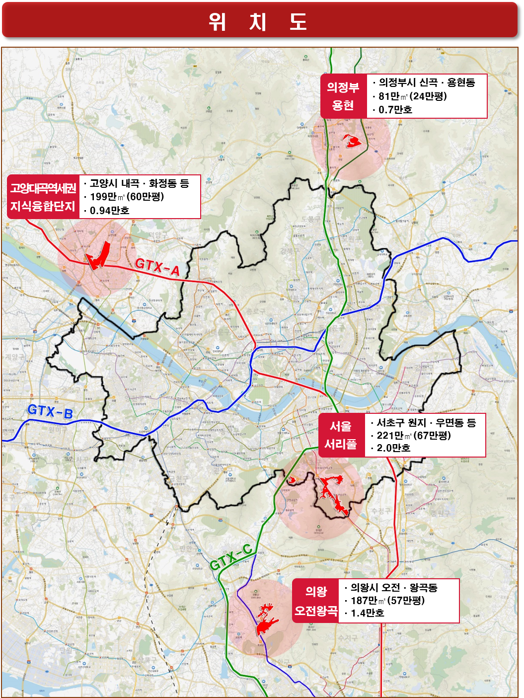 국토교통부가 8·8 주택공급 방안의 후속 조치로 신규 택지 후보지 4곳을 발표했습니다. 국토부는 이들 후보지에 대해 "환경적 보전 가치가 낮은 개발제한구역과 공장·창고 등이 난립해 난개발됐거나 난개발이 우려되는 지역으로 계획적·체계적 개발이 필요한 곳"이라고 설명했습니다. 신규 택지 후보지는 ▲ 서울 서초 서리풀지구 221만㎡(2만가구) ▲ 경기도 고양 대곡 역세권 지식융합단지 199만㎡(9천400가구) ▲ 경기도 의정부 용현 81만㎡(7천가구) ▲ 경기도 의왕 오전왕곡 187만㎡(1만4천가구)입니다.https://n.news.naver.com/mnews/article/001/0015026778?sid=100 서초·고양·의왕·의정부 등 4곳에 그린벨트 풀어 5만가구 짓는다서초 원지·우면동 일대 2만가구…..
