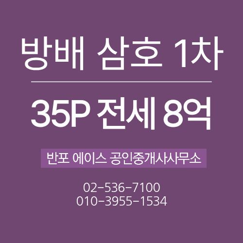 방배 삼호 1차는 3개동에 400여세대지만 주차는 1000대가 가능한 단지입니다.구축이지만 관리가 잘 되어 있고 동간 간격이 넓어서 다 채광이 좋을 것 같습니다.현재 방배 삼호 1,2차 함께 재건축 추진 중으로 현재 추진위 승인을 마치고 조합설립단계입니다. 위치는 서래초 도보 5분거리로 초등학생 자녀가 있는 집에서는 정말 좋은 위치입니다. 소개할 집은 매매는 아니구요 ^^;;; 전세입니다.입주 시기는 8월 10일~10월 8일 내로 조정가능합니다. 문의는 반포에이스 공인중개사 사무소로 연락주세요 ^^
