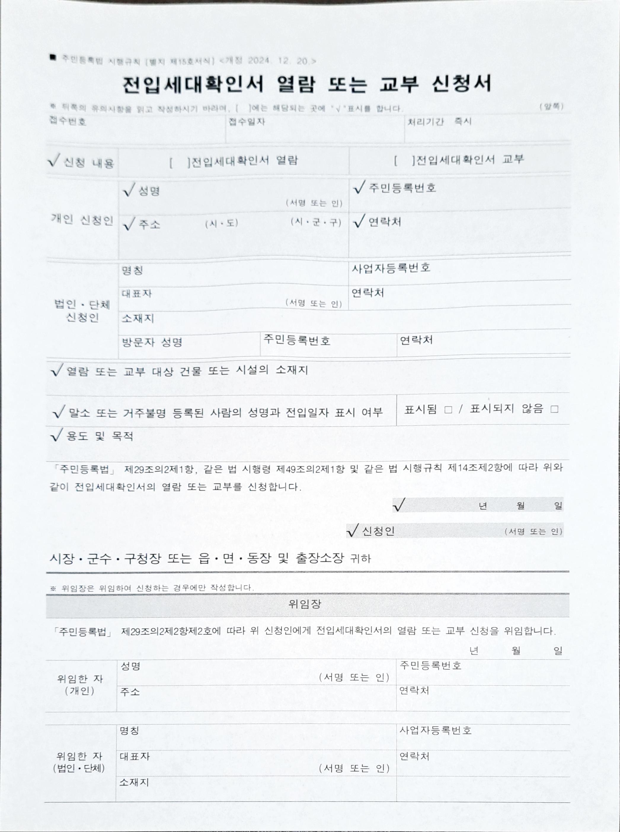 경공매를 하다보면 유료 옥션사이트를 이용해도 전입세대 확인이 안되거나 오래된 서류가 첨부되어 있는 경우가 있습니다. 적은 돈이 아닌만큼 투자에는 신중을 기해야하니, 투자하려 하는 물건을 정했다면 전입세대 확인은 해 보는 것이 좋은데요.(물론 전입세대 확인을 해봐도 실제와 또 다른 경우가 있을 수 있으니 직접 가서 확인해 보는 것이 가장 좋겠지만요) 내 집이나 대리인이 아니더라도 경공매의 경우에는 경공매에 나와있는 페이지 1-2장을 출력해 가면 전입세대 확인이 가능합니다. 준비물 : 경공매에 나와있는 물건정보 / 내 신분증 / 전입세대 확인서 신청서 신청서에 다음과 같은 정보를 넣고 신청하면 됩니다.첨부된 전입세대 확인서 신청서는 주민센터에 비치되어 있습니다.v 표시 되어 있는 곳에 체크하면 됩니다. 열람..