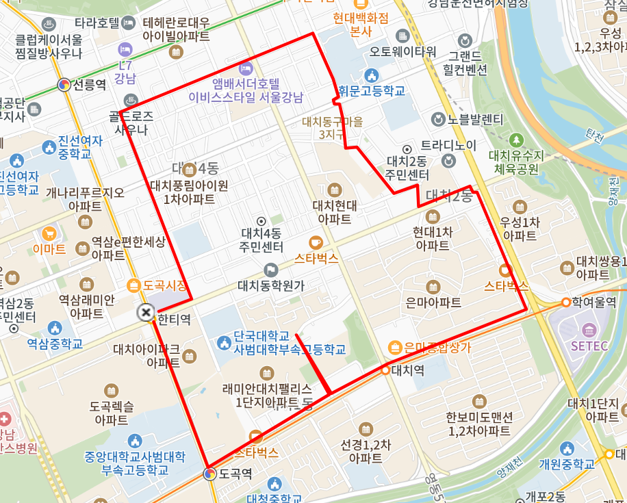 제가 걸은 코스입니다.  인간은 적응의 동물.오늘도 아침 10시의 기온은 28도였지만한달넘게 지속된 열대야가 끝나고그나마 좀 덜 후텁지근한 바람 분다고서늘하다고 느껴져서 임장을 나섬 ㅋ항상 마음은 9시 출발이지만 나가보면 10시 ㅋ 한티역 사거리에서 보이는 래미안 도곡카운티와 도곡렉슬래미안 도곡카운티는 한티역 앞 대로로 쭉 일렬로 되어있고도곡렉슬은 그 바로 뒤의 대단지로 구성되어있다. https://realty.daum.net/home/apt/danjis/19865 래미안도곡카운티강남구 도곡동 - 397세대 - 2016.09 입주realty.daum.nethttps://realty.daum.net/home/apt/danjis/8702 도곡렉슬강남구 도곡동 - 3,002세대 - 2006.01 입주realt..